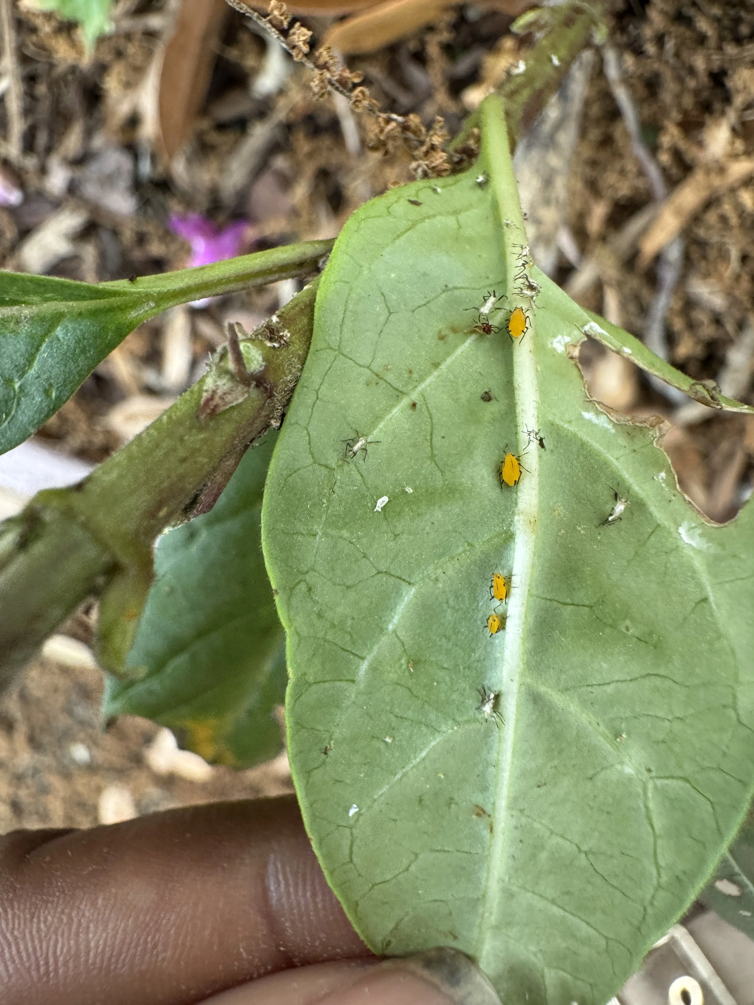 Aphids cluster on new growth and stem tips, usually on the underside of leaves. They come in green, black, or white. A strong blast of water from the hose dislodges most of them and disrupts the colony significantly. If populations are heavy, insecticidal soap or neem oil applied in the early morning works well — and both are selective enough to spare most beneficial insects.
