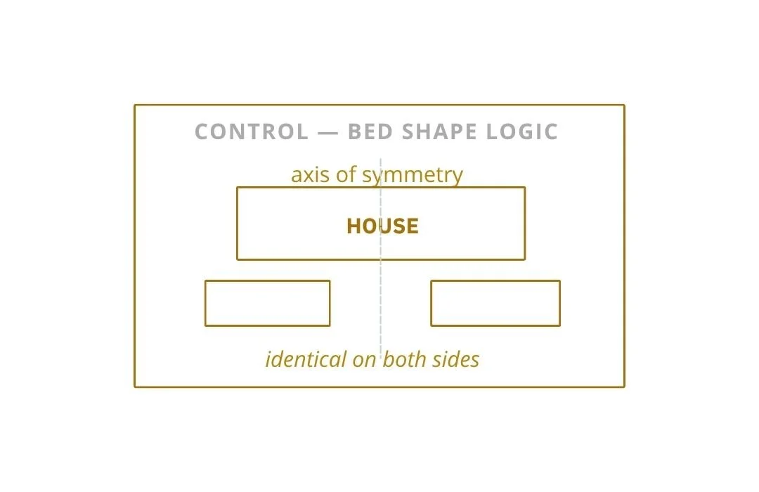 Identify the center axis of the front facade and treat it as the organizing line for everything in the beds