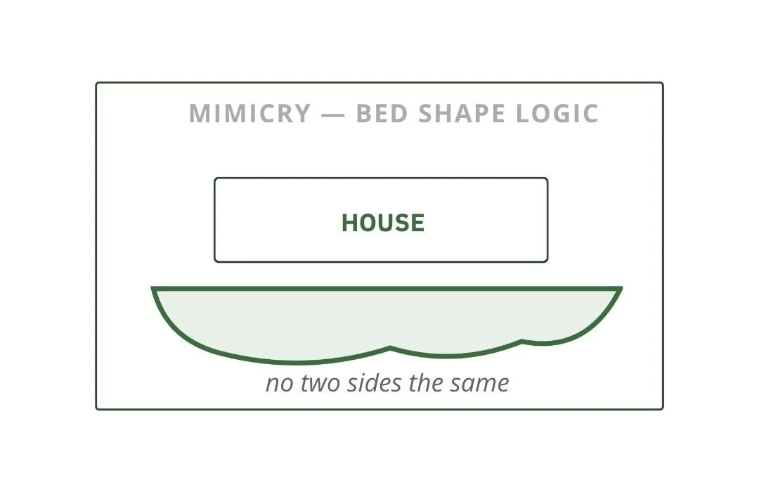 The diagnosis: The right geometry, unanchored. She was instinctively working in Mimicry — the geometry of nature, of sweeping irregular curves and odd-numbered plant clusters that bleed into each other. This is exactly where wildflower gardens belong. The problem wasn't the plants or the style. It was that without a defined bed edge and a repeated visual element to create rhythm, the planting read as accidental from the street rather than intentional. The lawn company mowed it because it looked like lawn. A passerby couldn't tell the difference either.