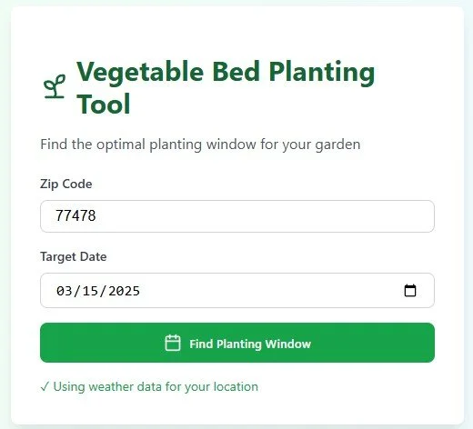 Screenshot of a vegetable bed planting tool webpage with input fields for zip code and target date, and a green 'Find Planting Window' button.